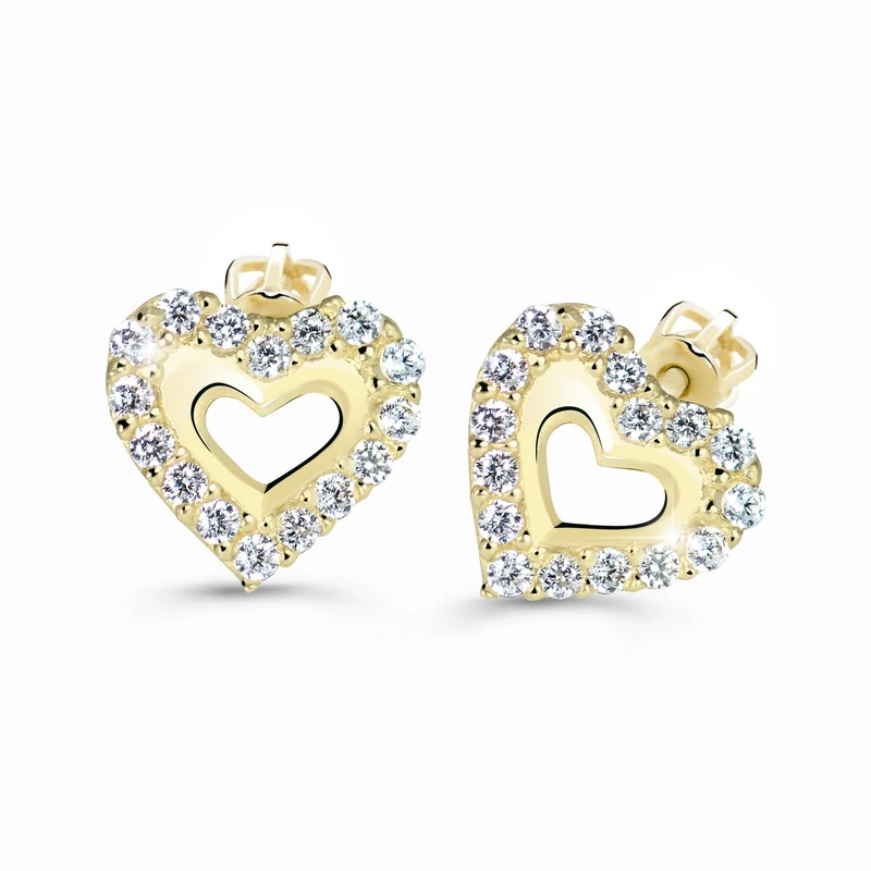 Zlaté náušnice se zirkony vyrobené ze zlata ryzosti 585/000. Zlaté náušnice s ozdobou srdíček velikosti 6x7 mm. Naušnicové zapínání na je na šroubek. Průměr šroubovacího zapínání 4 mm.
