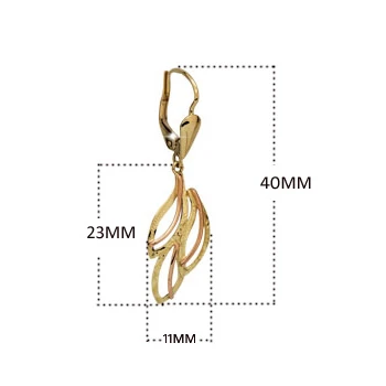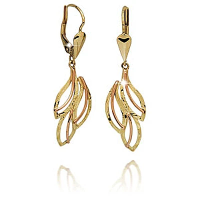 Zlaté náušnice kombinující žluté a růžové zlato ryzosti 585/1000. Povrch náušnic je leštěný se vzorem. Náušnice mají zapínání na klapku. Celková "délka" náušnice 40mm. Rozměry náušnic najdete zobrazené na podpůrné fotografii. Náušnice zdarma zabalíme do dárkové krabičky a papírové tašky.
