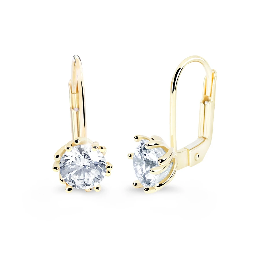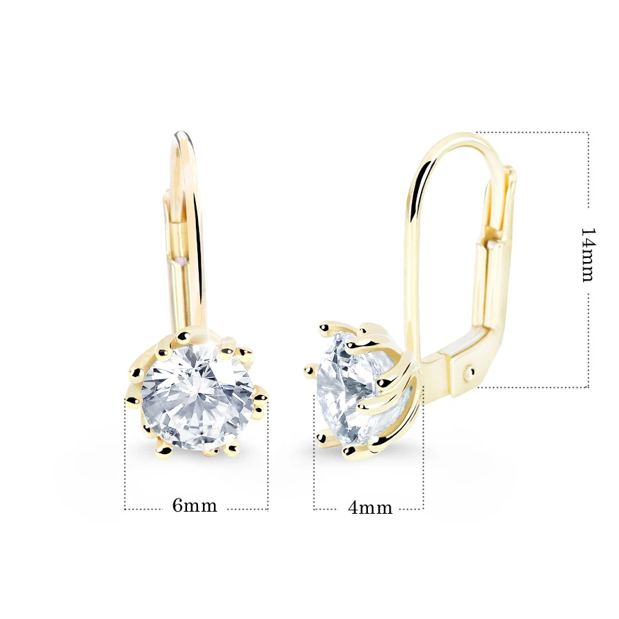 Zlaté visací náušnice se zirkony ze žlutého zlata ryzosti 585/1000. Elegantní zlaté visací náušnice ozdobené 6mm zirkony. Náušnicové zapínání je na klapku. Rozměry náušnic najdete zobrazené na podpůrné fotografii.