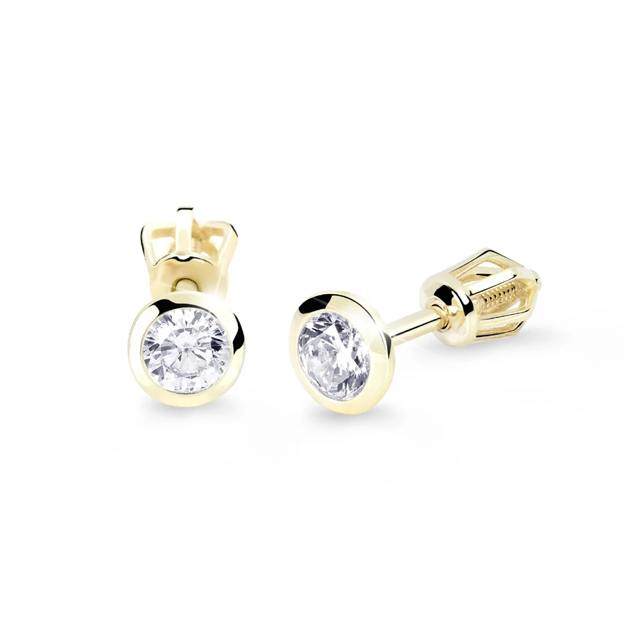 Náušnice ze žlutého zlata se zirkony. Zlaté náušnice pecky se zapínáním na šroubek. Rozměry náušnic naleznete zobrazené na podpůrném obrázku.