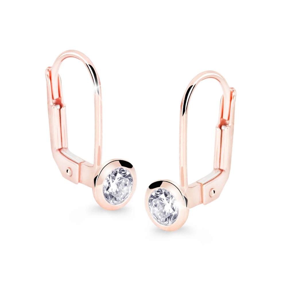 Zlaté visací náušnice se zirkony z růžového 14.ti karátového zlata. Dívčí náušnice se zirkony. Náušnicové zapínání je na klapku. Rozměry náušnic najde přehledně zobrazené na podpůrné fotografii.