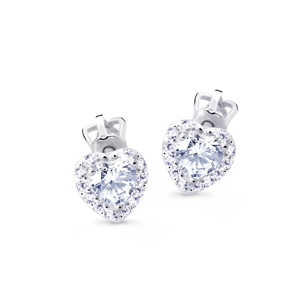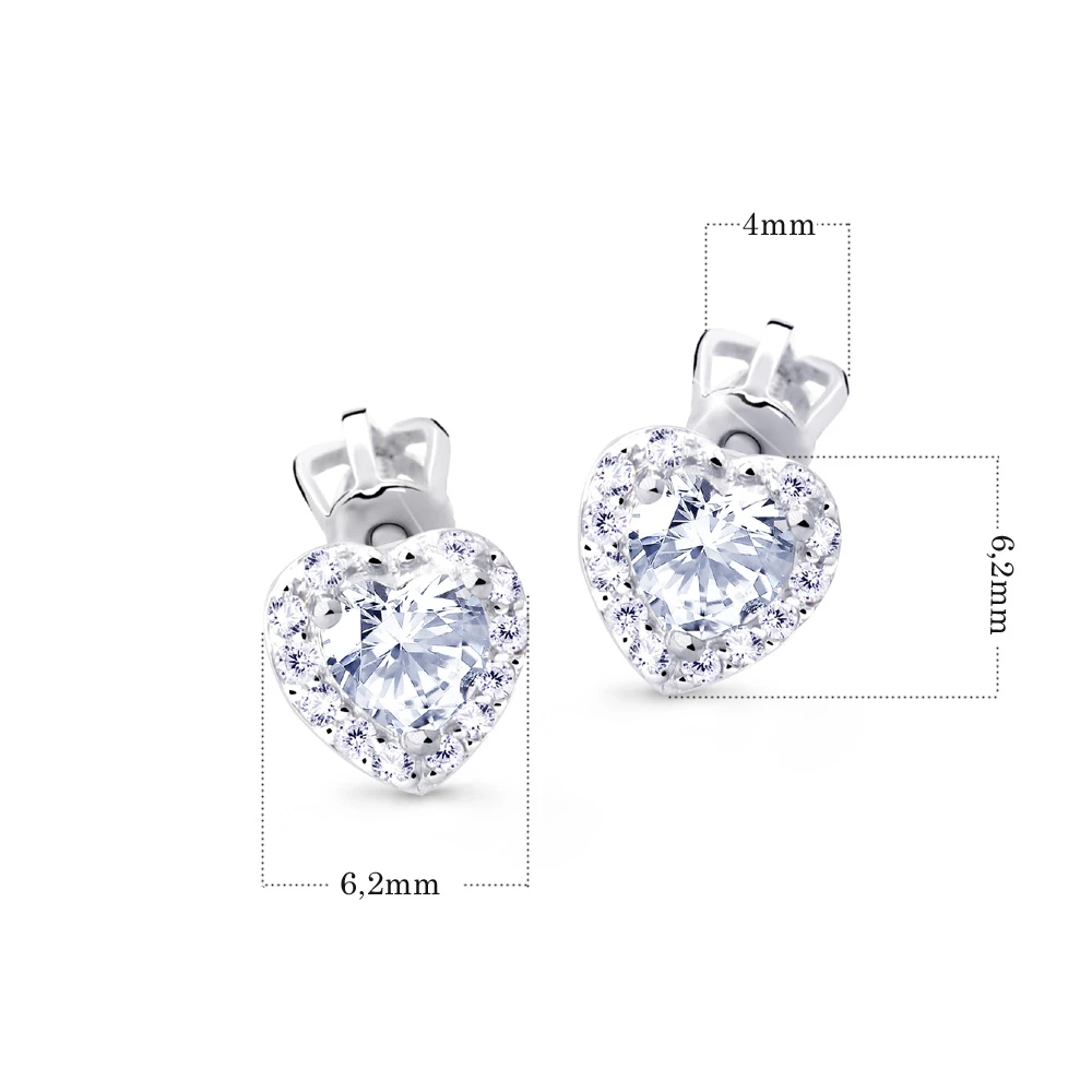 Zlaté náušnice srdíčka z bílého zlata ryzosti 585/1000. Náušnice zdobí zirkony a jsou určené pro ženy a dívky. Náušnicové zapínání je na šroubek. Rozměry náušnic 6,2x6,2mm, najdete přehledně zobrazené na podpůrné fotografii. Krásné zlaté náušnice se srdíčky pro vaše drahé.