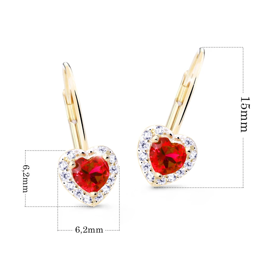 Zlaté visací náušnice srdíčka ze žlutého zlata ryzosti 585/1000. Náušnice zdobí zirkony a jsou určené pro ženy a dívky. Náušnicové zapínání je na klapku. Rozměry náušnic 15x6,2x6,2mm, najdete přehledně zobrazené na podpůrné fotografii. Krásné zlaté visací náušnice se srdíčky pro vaše drahé.
