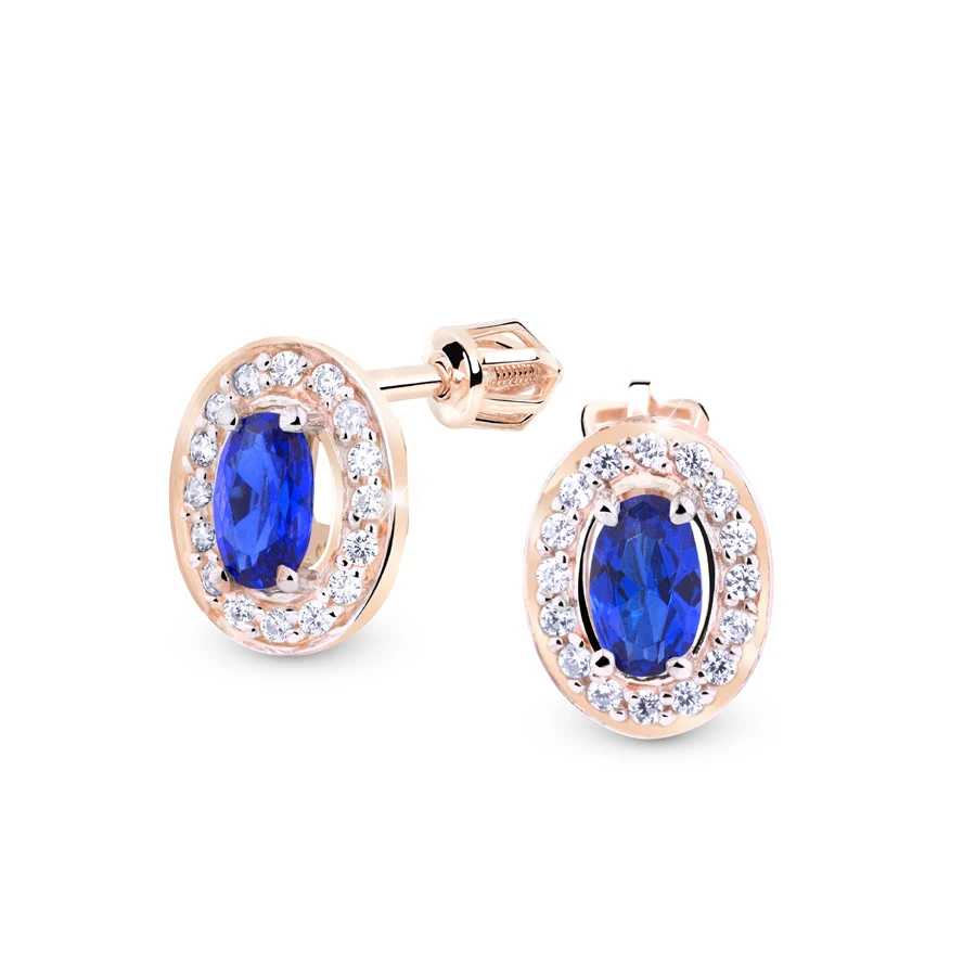 Zlaté náušnice se zirkony oválky. Náušnice jsou vyrobeny z růžového zlata 585/1000 a osazené jsou prvotřídními zirkony. Zapínání náušnic je na šroubek. Výška náušnic 9mm, šířka 7mm.