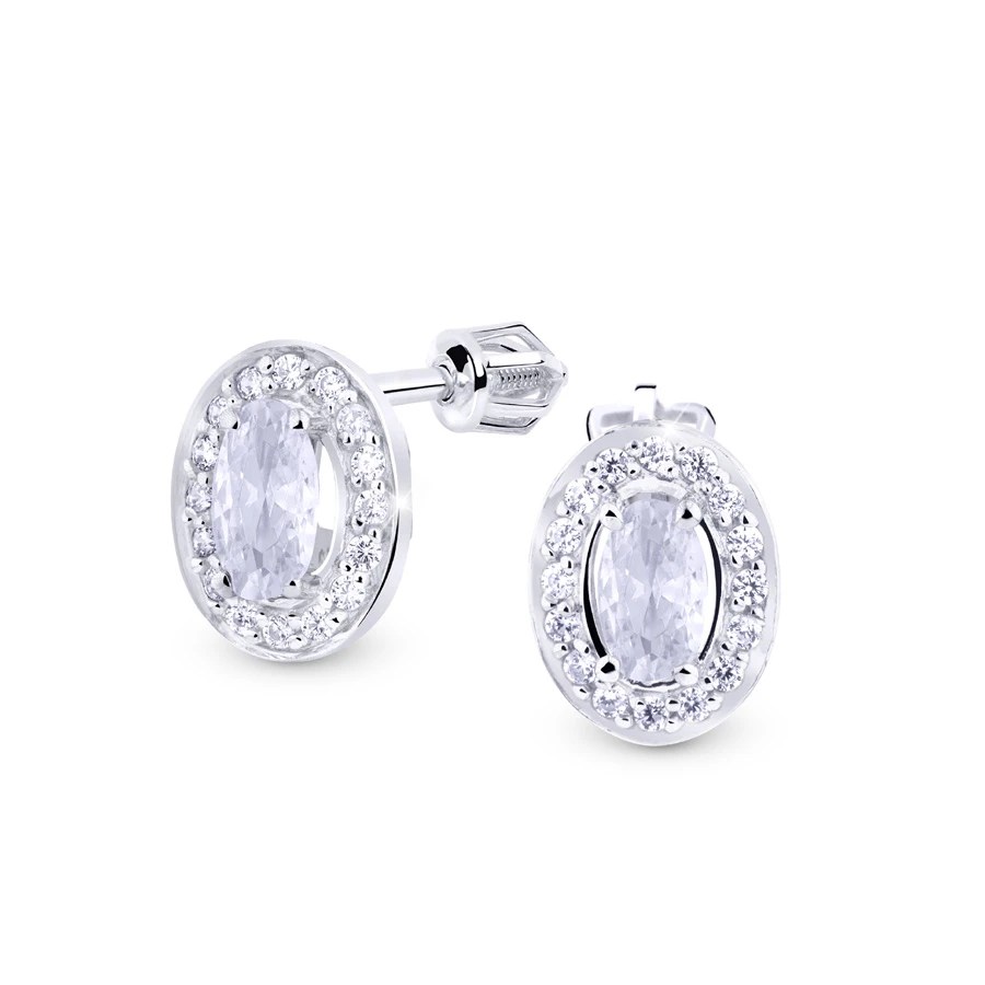 Zlaté náušnice se zirkony oválky. Náušnice jsou vyrobeny z bílého zlata 585/1000 a osazené jsou prvotřídními zirkony. Vysoká kvalita použitých materiálů Vám zaručí nadčasovou eleganci a bezchybný vzhled náušnic po mnoho let. Zapínání náušnic je na šroubek. Výška náušnic 9mm, šířka 7mm.