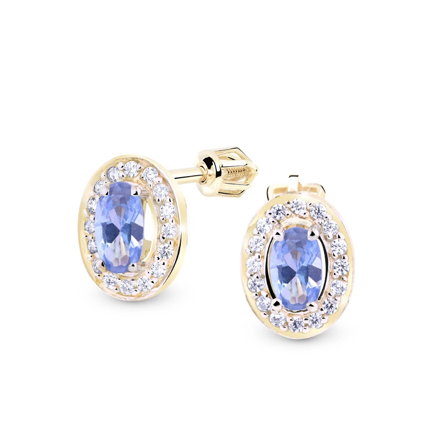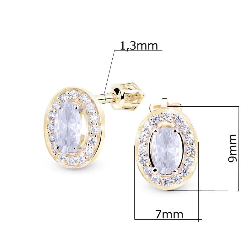 Zlaté náušnice se zirkony oválky. Náušnice jsou vyrobeny ze žlutého zlata 585/1000 a osazené jsou prvotřídními zirkony. Zapínání náušnic je na šroubek. Výška náušnic 9mm, šířka 7mm.