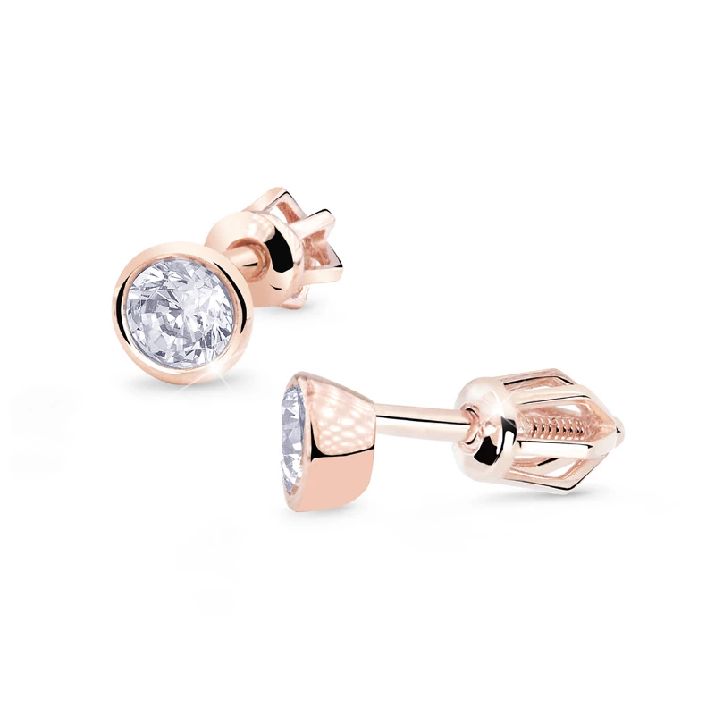 Náušnice z růžového zlata 585/1000 se zirkony. Zlaté náušnice pecky se zapínáním na šroubek. Průměr ozdoby se zirkonem 5mm. Rozměry náušnic naleznete zobrazené na podpůrném obrázku.