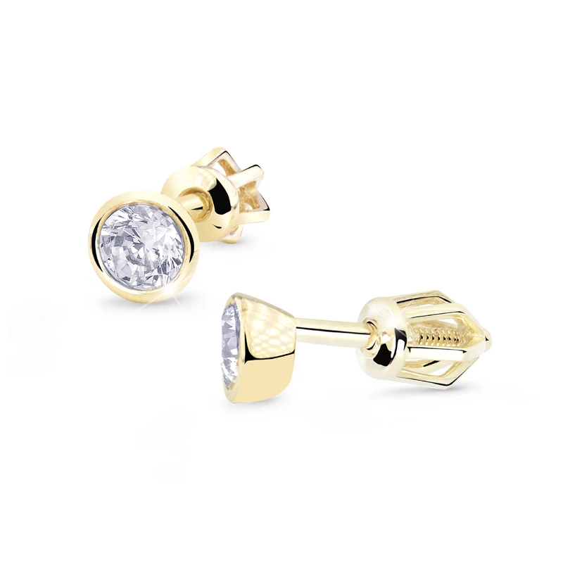 Náušnice ze žlutého zlata 585/1000 se zirkony. Zlaté náušnice pecky se zapínáním na šroubek. Průměr ozdoby se zirkonem 5mm. Rozměry náušnic naleznete zobrazené na podpůrném obrázku.