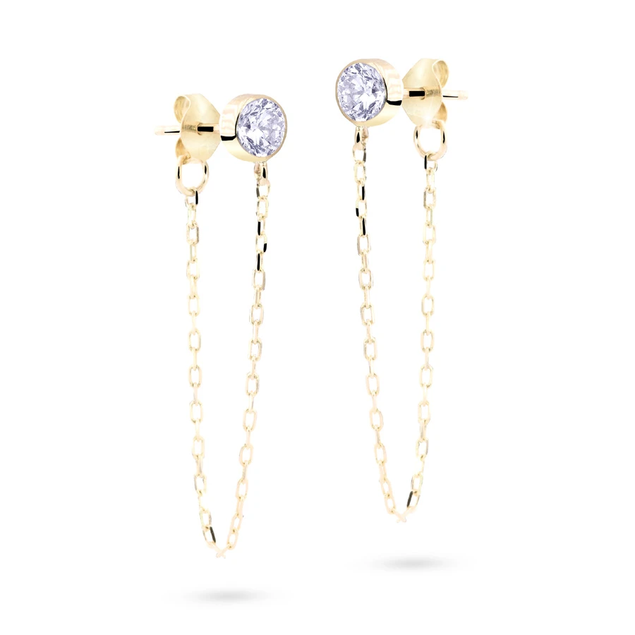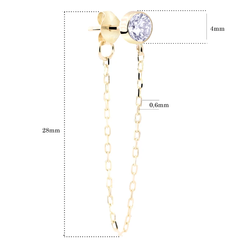 Zlaté náušnice ze zlata 585/1000.Náušnice s řetízkem, na kterém je připevněné náušnicové zapínání, a nehrozí tak jeho nechtěná ztráta. Ozdoba se zirkonem má průměr 4mm, délka náušnice 28mm. Náušnicové zapínání je na puzetky.