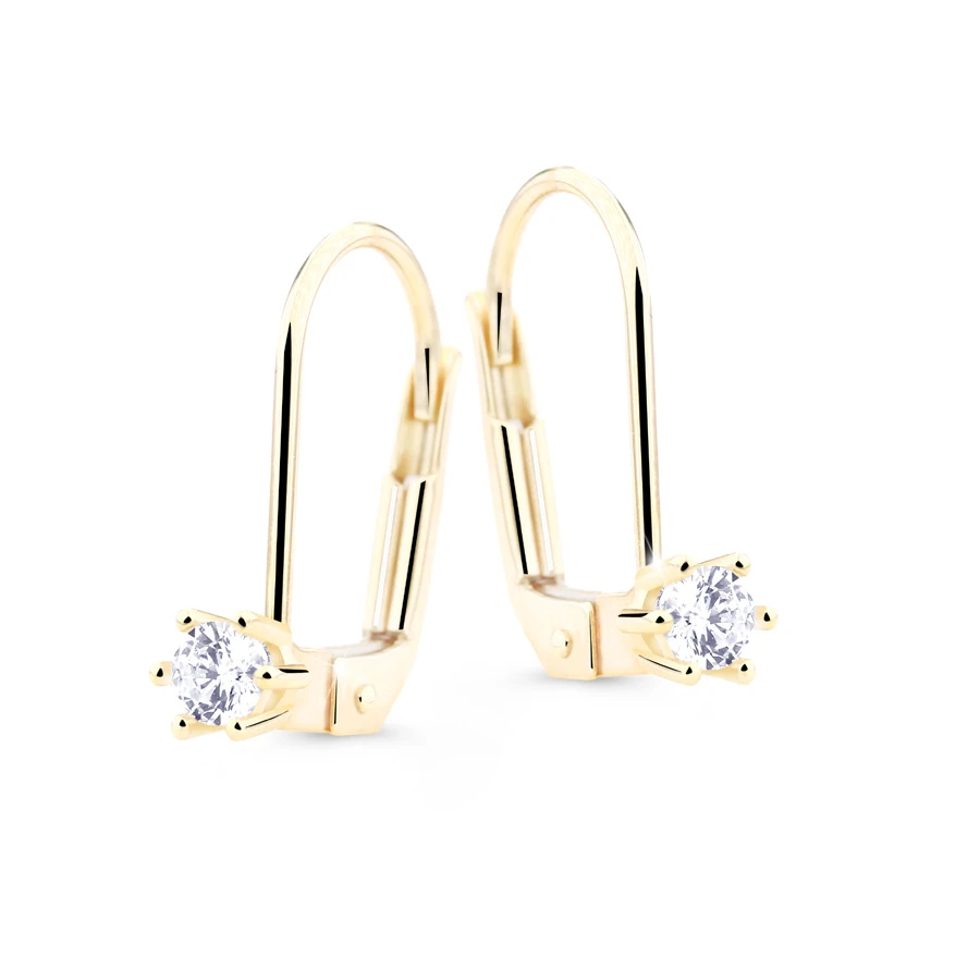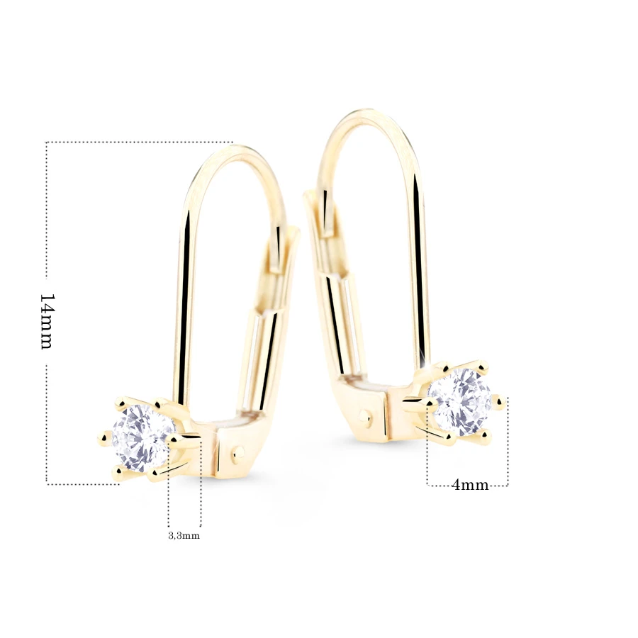 Zlaté náušnice se zirkony vyrobené ze zlata ryzosti 585/1000. Dámské zlaté visací náušnice zdobené 4mm zirkony. Náušnicové zapínání je na klapku. Rozměry náušnic najdete zobrazené na podpůrné fotografii.