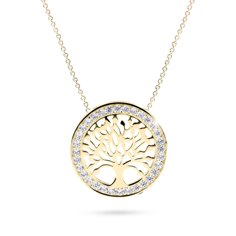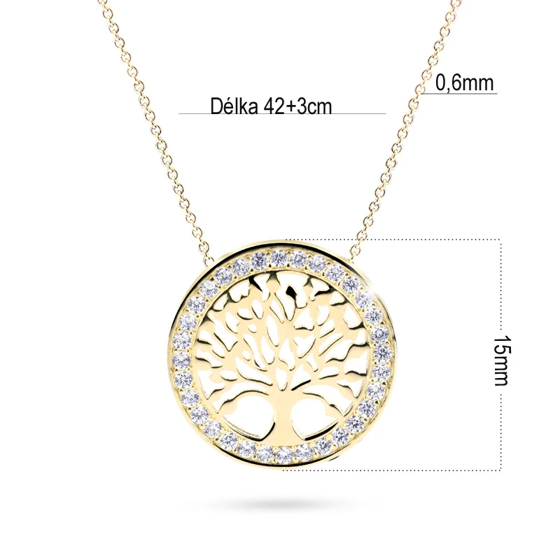 Dámský náhrdelník ze žlutého zlata 585/1000. Ozdoba se stromem života má průměr 15mm. Strom života je dokola osazený prvotřídními zirkony. Délku náhrdelníku lze pomocí nastavovacího řetízku upravovat v rozmezí 42-45cm.