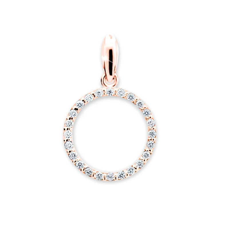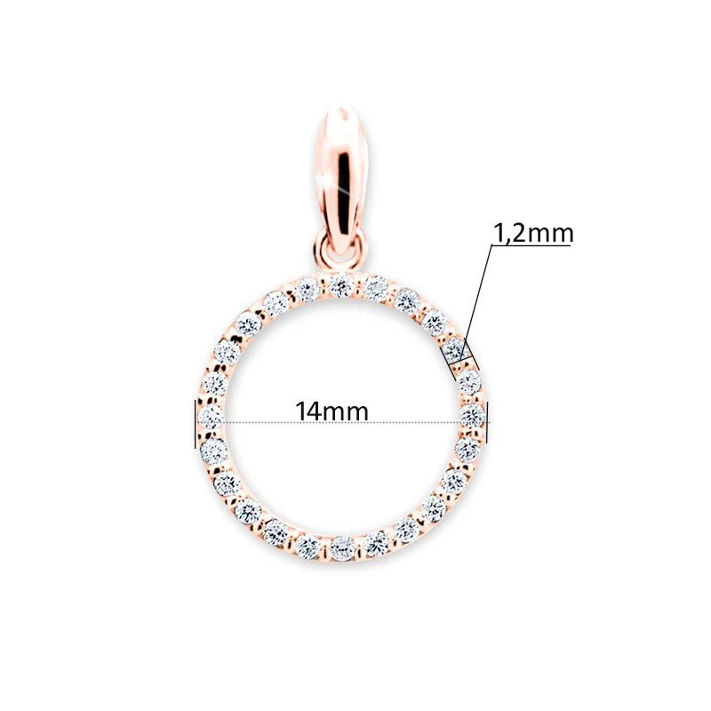 Přívěsek se zirkony z růžového zlata ryzosti 585/1000. Přívěsek má vnější průměr 14mm, obroučka přívěsku je široká 1,2mm a je dokola osazená zirkony. Zlatý řetízek vhodný k přívěsku najdete v kategorii řetízky. Přívěsek je dodávaný včetně dárkové krabičky a papírové tašky.