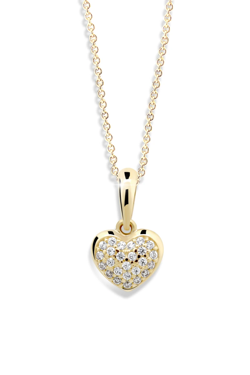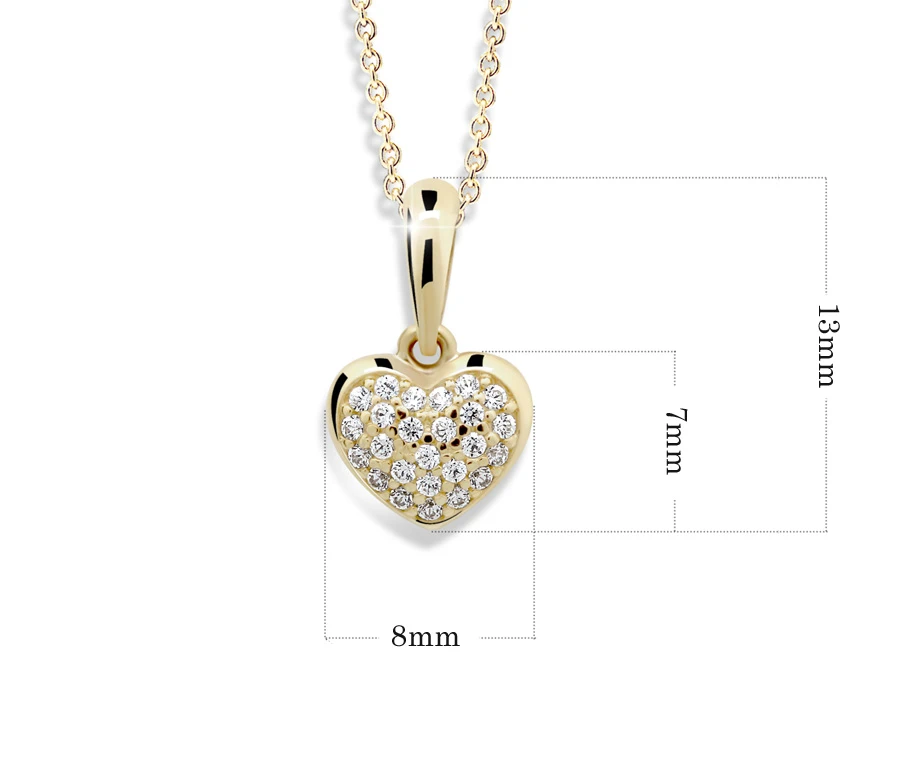 Přívěšek na řetízek srdíčko ze žlutého zlata ryzosti 585/1000. Přívěsek je celý ozdobený zirkony. Závěsným očkem na přívěsku lze protáhnout zlatý řetízek s průměrem do 2,0mm. Srdíčko má rozměr 8x7mm. Celkové rozměry přívěsku najdete zobrazené na podpůrné fotografii.