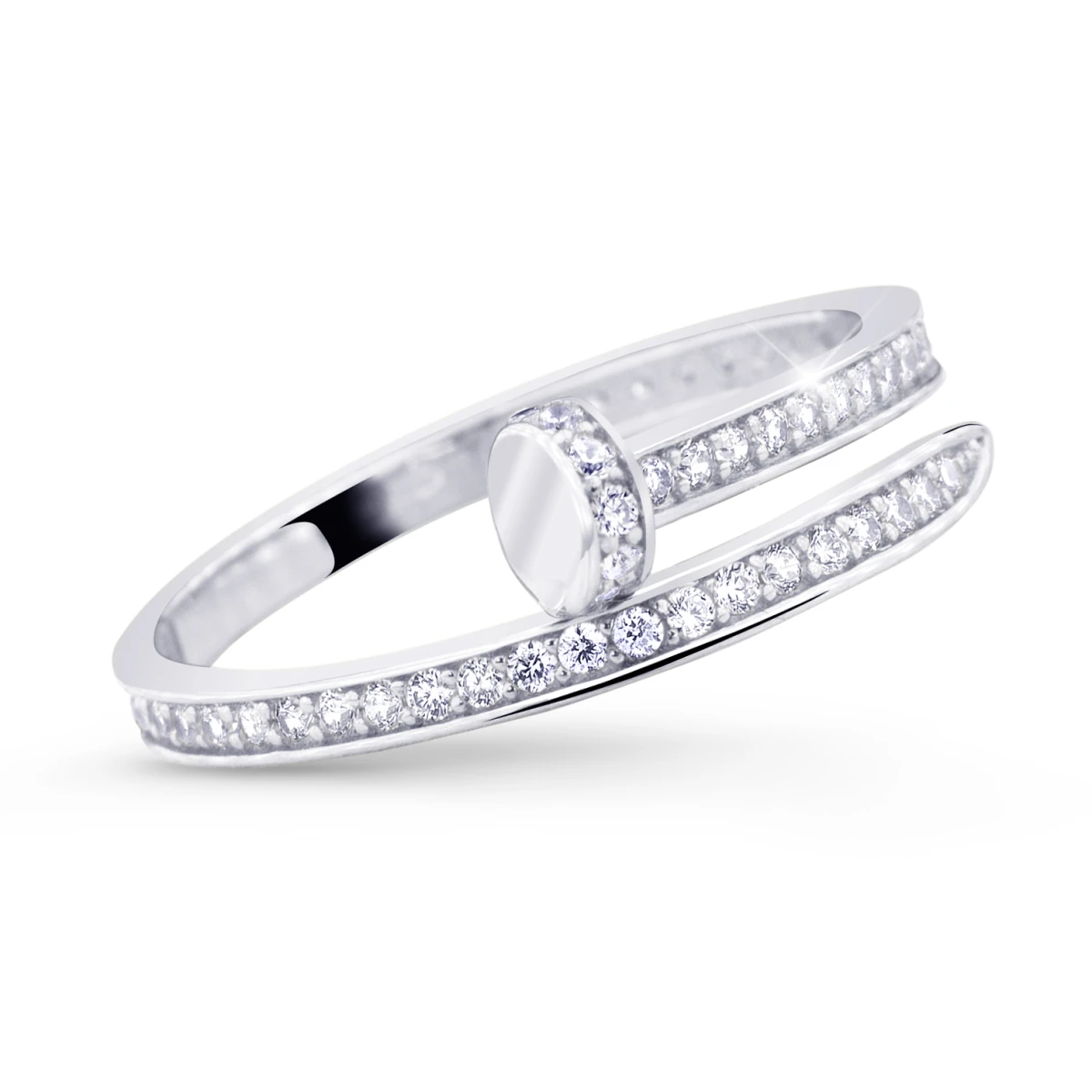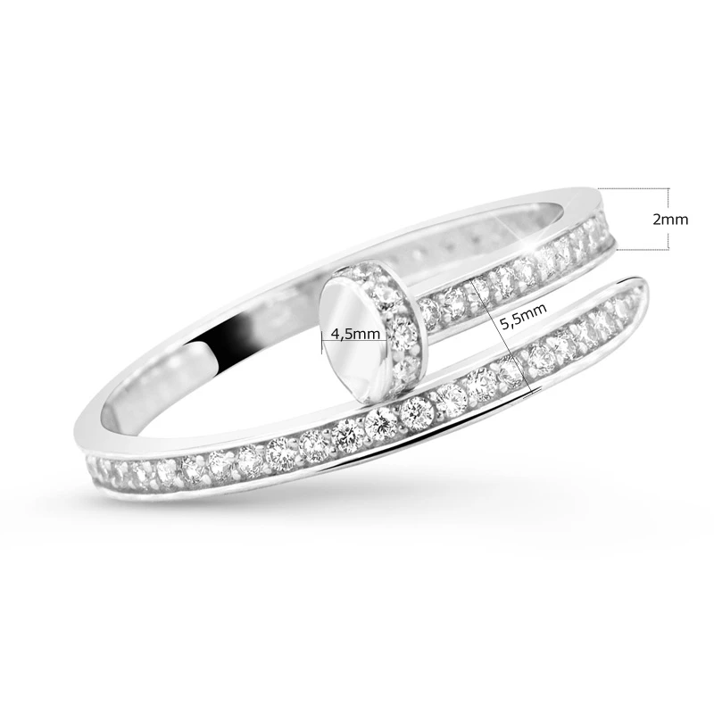 Prsten z bílého zlata ryzosti 585/1000. Prsten je osazený prvotřídními zirkony. Obroučka prstýnku je široká 2,0mm. Celkové rozměry prstenu najdete na podpůrné fotografii.