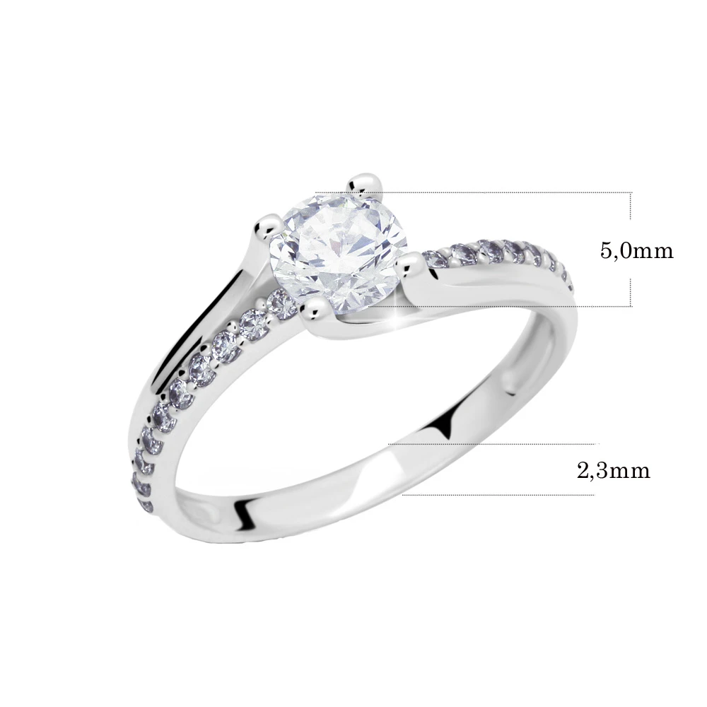 Prsten z bílého zlata 585/1000 se zirkony. Prstýnek je zdobený jedním velkým zirkonem s průměrem 5mm, polovina obroučky je osazená malými zirkony v řadě. Dámský zlatý prsten s leštěným povrchem. Prstýnek je v místě ozdoby s velkým zirkonem široký 5mm, obroučka prstenu je široká 2,3mm. Krásný zlatý prstýnek se zirkony.
