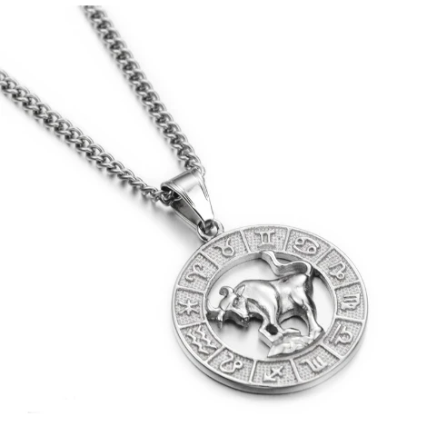 Přívěsek ve znamení býka (21.4 - 21.5). Přívěsek je zhotovený z chirurgické oceli. Znamení býka je "lemováno" symboly ostatních znamení zvěrokruhu. Ke znamení náleží řetízek z chirurgické oceli vzor pancr se zapínáním na karabinu, dlouhý 60cm. Přívěsek má průměr 30mm. Řetízek lze na přání zdarma zkrátit.