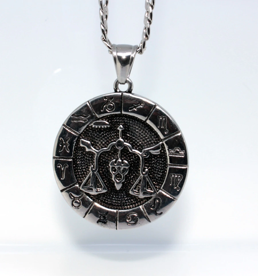 Přívěsek ve znamení vah (23.9-23.10). Přívěsek je zhotovený z chirurgické oceli. Znamení vah je "lemováno" symboly ostatních znamení zvěrokruhu. Ke znamení náleží řetízek z chirurgické oceli vzor pancr se zapínáním na karabinu, dlouhý 60cm. Přívěsek má průměr 34mm. Řetízek lze na přání zdarma zkrátit.